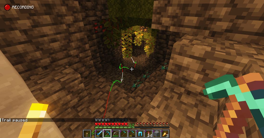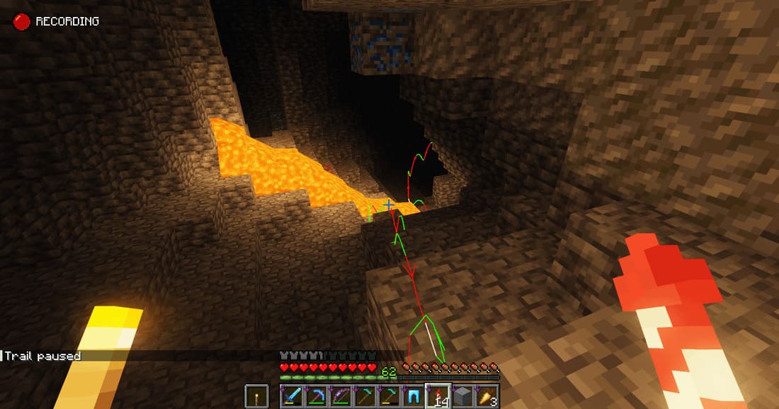Достаточно будет просто развернуться и увидеть этот путь и пойти по нему обратно. Мод даже работает в мультиплеере и можно видеть пути твоих друзей. На кнопку V (англ.) можно включить и выключить отображение пути, а два раза щелкнув по ней можно полностью сбросить трек. На кнопку B (англ.) можно увидеть пути других игроков.
